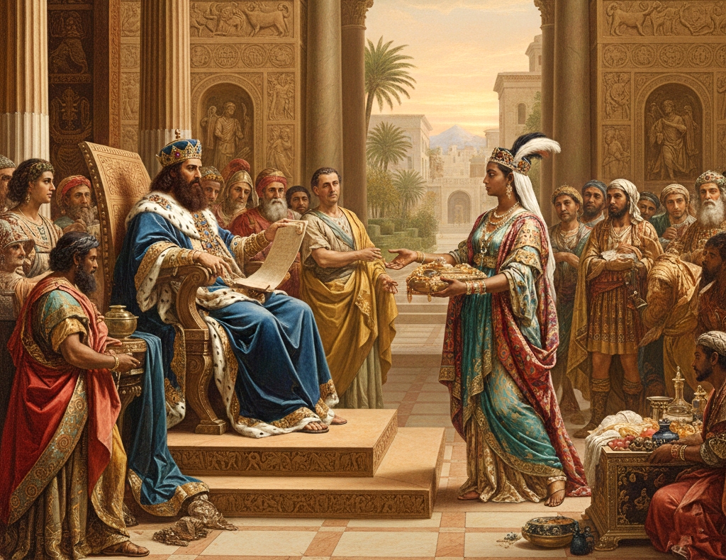 Regina din Saba (undeva prin Etiopia – Yemen) auzise despre regele israelit lucruri care păreau neverosimile și curiozitatea ei s-a aprins. A străbătut drumul până la Ierusalim „cu un alai foarte mare și cu cămile care aduceau mirodenii, aur foarte mult și pietre scumpe”.(1 Împărați, 10:2) După ce i-a oferit daruri regelui, l-a supus unui test, bombardându-l cu întrebări, iar „Solomon i-a răspuns la toate”. (vers 3)