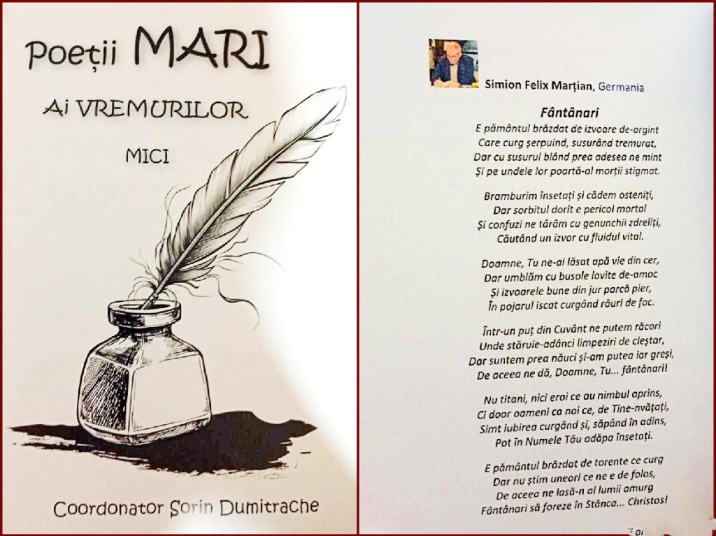 Cu gândul cocoțat a năzuință Și răsucit pe-al întrebării semn, Dam pinteni tainelor, semeț și demn, În vechi retorte distilând știință. Vream miezul vieții, într-un nimb solemn, Trofeu sculptat de propria-mi dorință, Dar am văzut că astea-s cu putință Doar... sus pe deal, sub crucea grea de lemn. Mi-e căutarea azi doar amintire, Căci am găsit, etern și glorios, Tezaurul ce-l am ca moștenire. Și-n pace-nfășurat, stau radios Într-un hamac țesut din mulțumire, Iar la-ntrebări îmi dă răspuns... Christos! Simion Felix Marțian Siegen, 28 ianuarie 2022