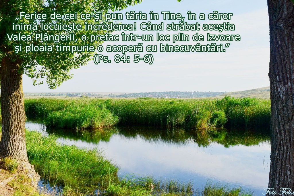 „Ferice de cei ce-şi pun tăria în Tine, în a căror inimă locuieşte încrederea! Când străbat aceştia Valea Plângerii, o prefac într-un loc plin de izvoare şi ploaia timpurie o acoperă cu binecuvântări.” (Ps. 84: 5-6)
