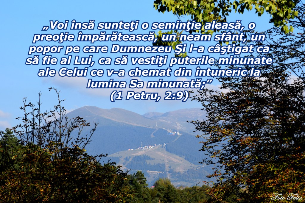 Voi însă sunteţi o seminţie aleasă, o preoţie împărătească, un neam sfânt, un popor pe care Dumnezeu Şi l-a câştigat ca să fie al Lui, ca să vestiţi puterile minunate ale Celui ce v-a chemat din întuneric la lumina Sa minunată; (1 Petru, 2:9)