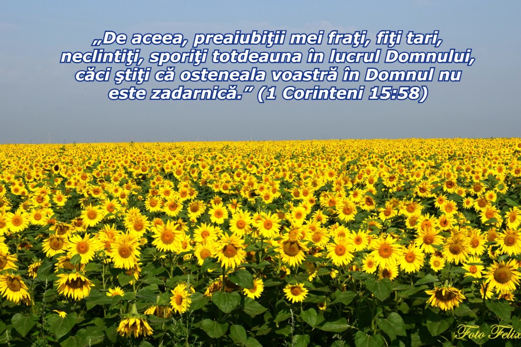 „De aceea, preaiubiţii mei fraţi, fiţi tari, neclintiţi, sporiţi totdeauna în lucrul Domnului, căci ştiţi că osteneala voastră în Domnul nu este zadarnică.” (1 Corinteni, 15:58)