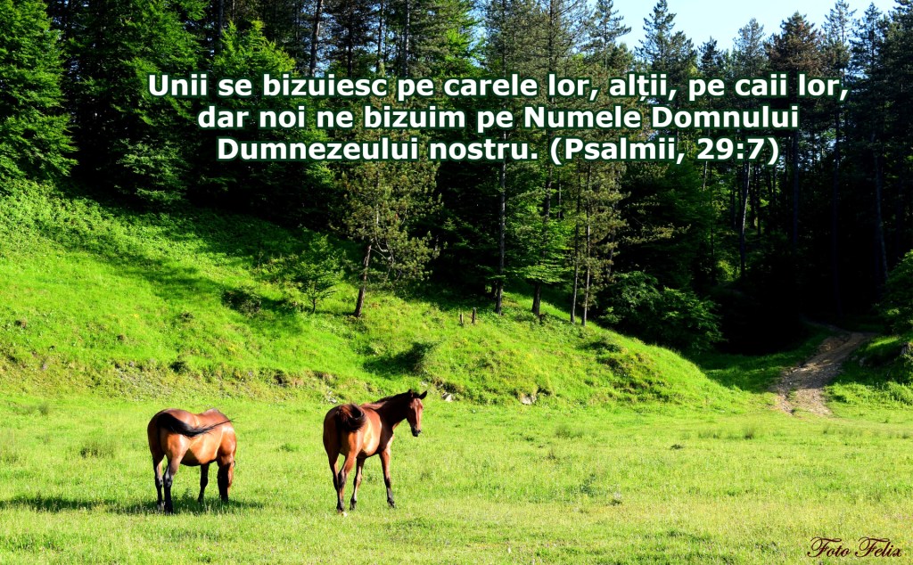 Unii se bizuiesc pe carele lor, alții, pe caii lor, dar noi ne bizuim pe Numele Domnului Dumnezeului nostru. (Psalmii, 29:7)