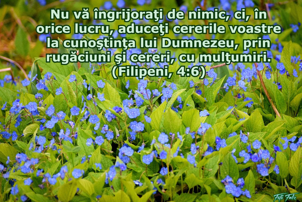 Nu vă îngrijoraţi de nimic, ci, în orice lucru, aduceţi cererile voastre la cunoştinţa lui Dumnezeu, prin rugăciuni şi cereri, cu mulţumiri. (Filipeni, 4:6)