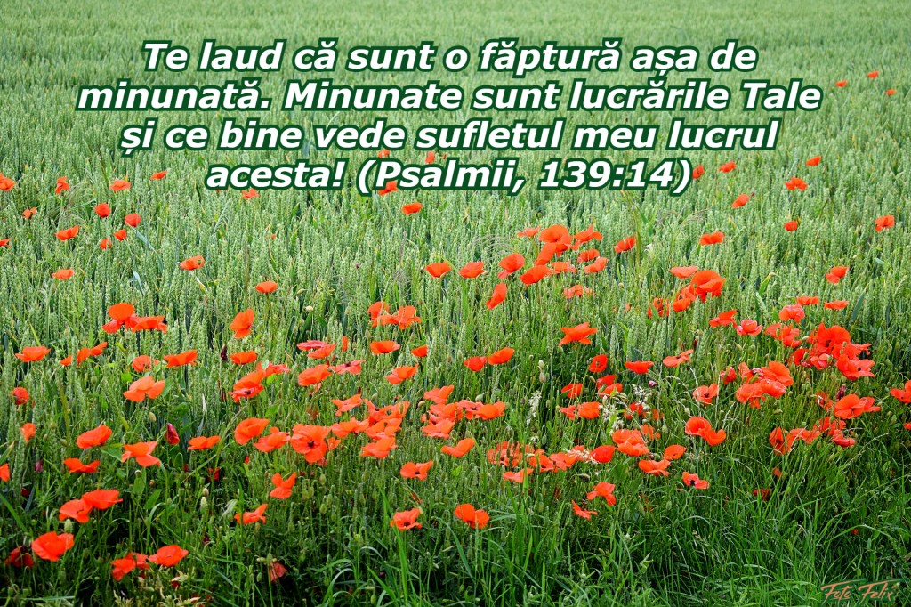 Te laud că sunt o făptură așa de minunată. Minunate sunt lucrările Tale și ce bine vede sufletul meu lucrul acesta! (Psalmii, 139:14)