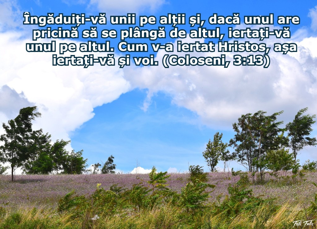 Îngăduiți-vă unii pe alții și, dacă unul are pricină să se plângă de altul, iertați-vă unul pe altul. Cum v-a iertat Hristos, așa iertați-vă și voi. (Coloseni, 3:13)