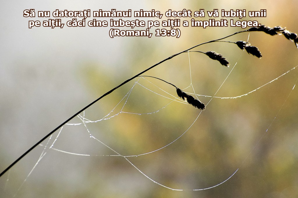 Să nu datorați nimănui nimic, decât să vă iubiți unii pe alții, căci cine iubește pe alții a împlinit Legea. (Romani, 13:8)